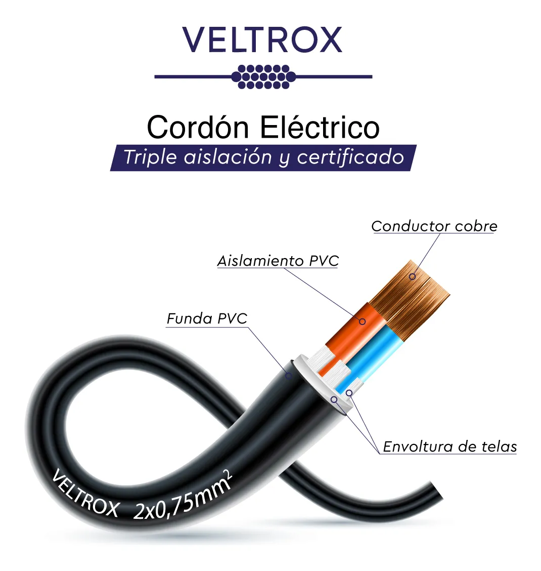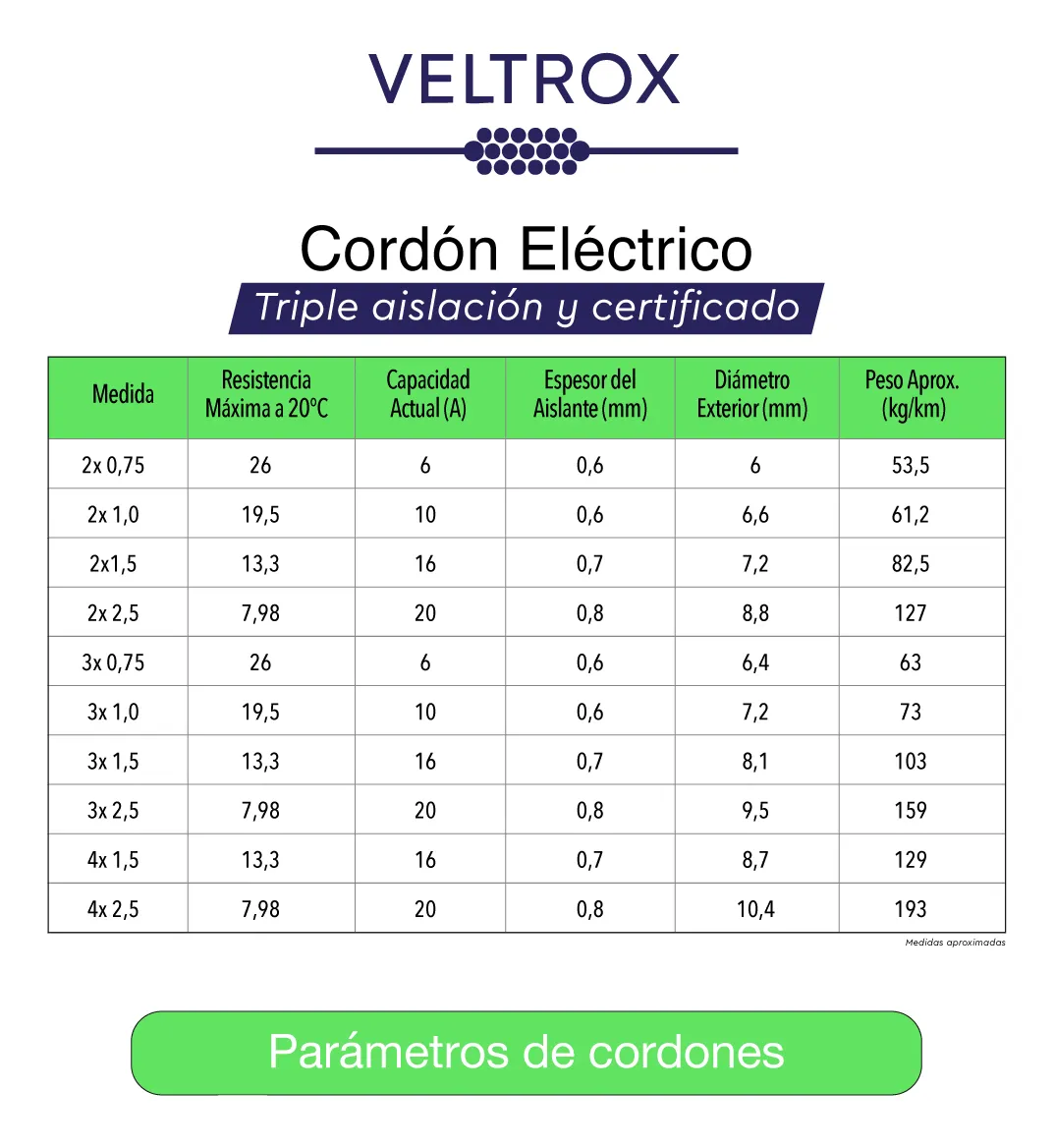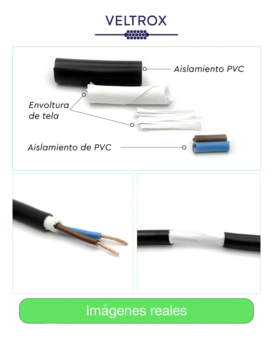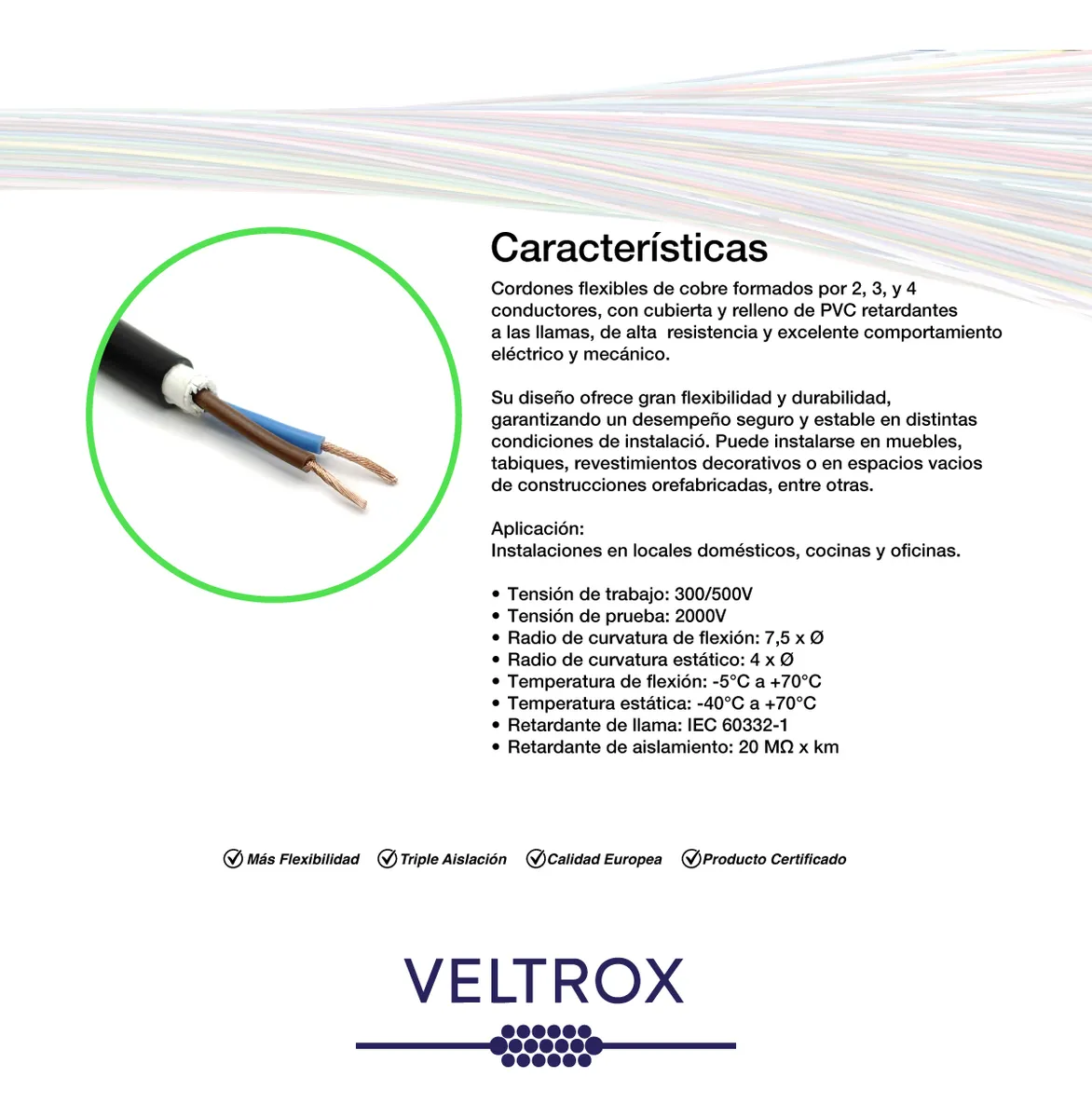 Conductor Flexible, PVC Retardante de llamas. Tensión de Prueba 2000V. Radio de curvatura de flexión 7,5 x Ø. Radio de curvatura estático 4 x Ø. Temperatura de flexión -5°C a + 70 °C. Temperatura estática -40 °C a + 70 °C. Retardante de llama IEC 60332-1 Resistencia de aislamiento 20 MΩ x Km. Ideal para aparatos domésticos, lavadoras, centrifugas, refrigeradores. Conductor de cobre flexible. Aislamiento de PVC. Envoltura de telas Funda exterior de PVC.