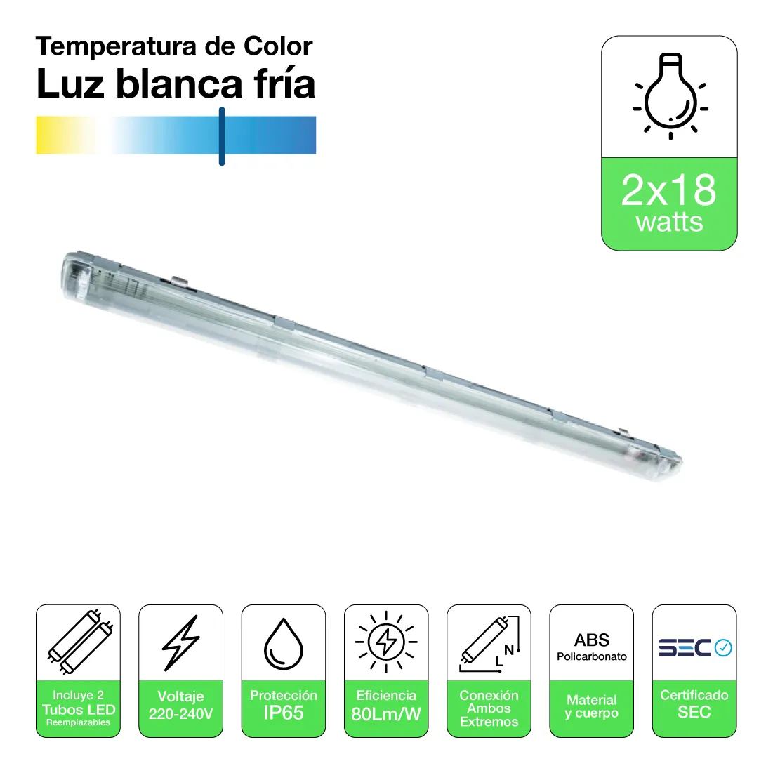 Equipo hermético al polvo protegido contra el agua proyectada. Conexión en ambos lados. 6 meses de garantía por falla de fábrica. No entra un Kit de Emergencia.